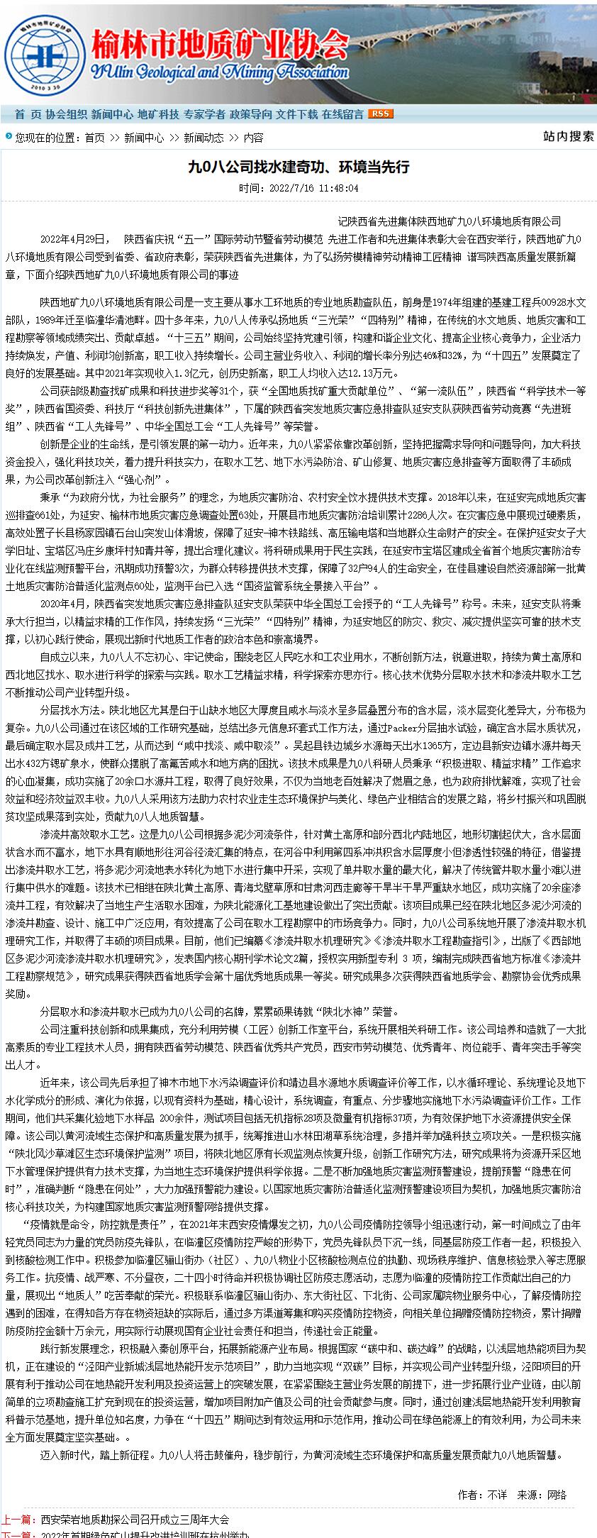 7月16日,榆林市地质矿业协会以《九0八公司找水建奇功、环境当先行》为题,报道了九0八公司四十八年来在水工环地质、Packer取水工艺 、渗流井高效取水工艺,地下水污染防治,矿山修复,地质灾害防治等领域和国企社会责任方面取得的成绩。