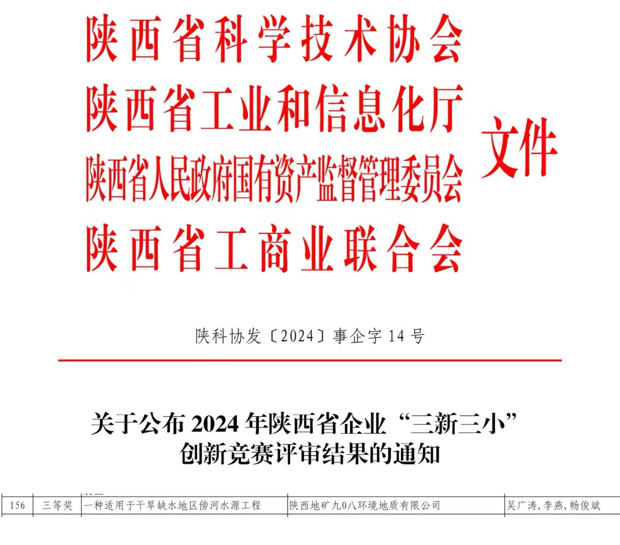 喜讯丨陕西地矿九0八公司申报的一项技术成果荣获2024年陕西省企业“三新三小”创新竞赛三等奖