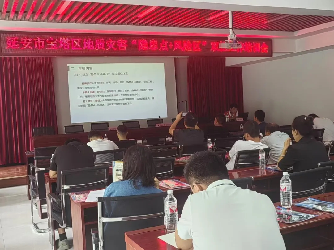 支队杜鹏同志,通过展示与分析典型案例,重点讲解宝塔区地质灾害类型与分布现状,分析地质灾害易发的原因,生动形象地普及防灾避险知识。同时针对“双控”工作,细致的解读相关政策,聚焦于各级防治责任人的日常工作职责以及具体的灾害防范措施组织了专题培训,旨在提升全员的风险防控与应急管理能力。
