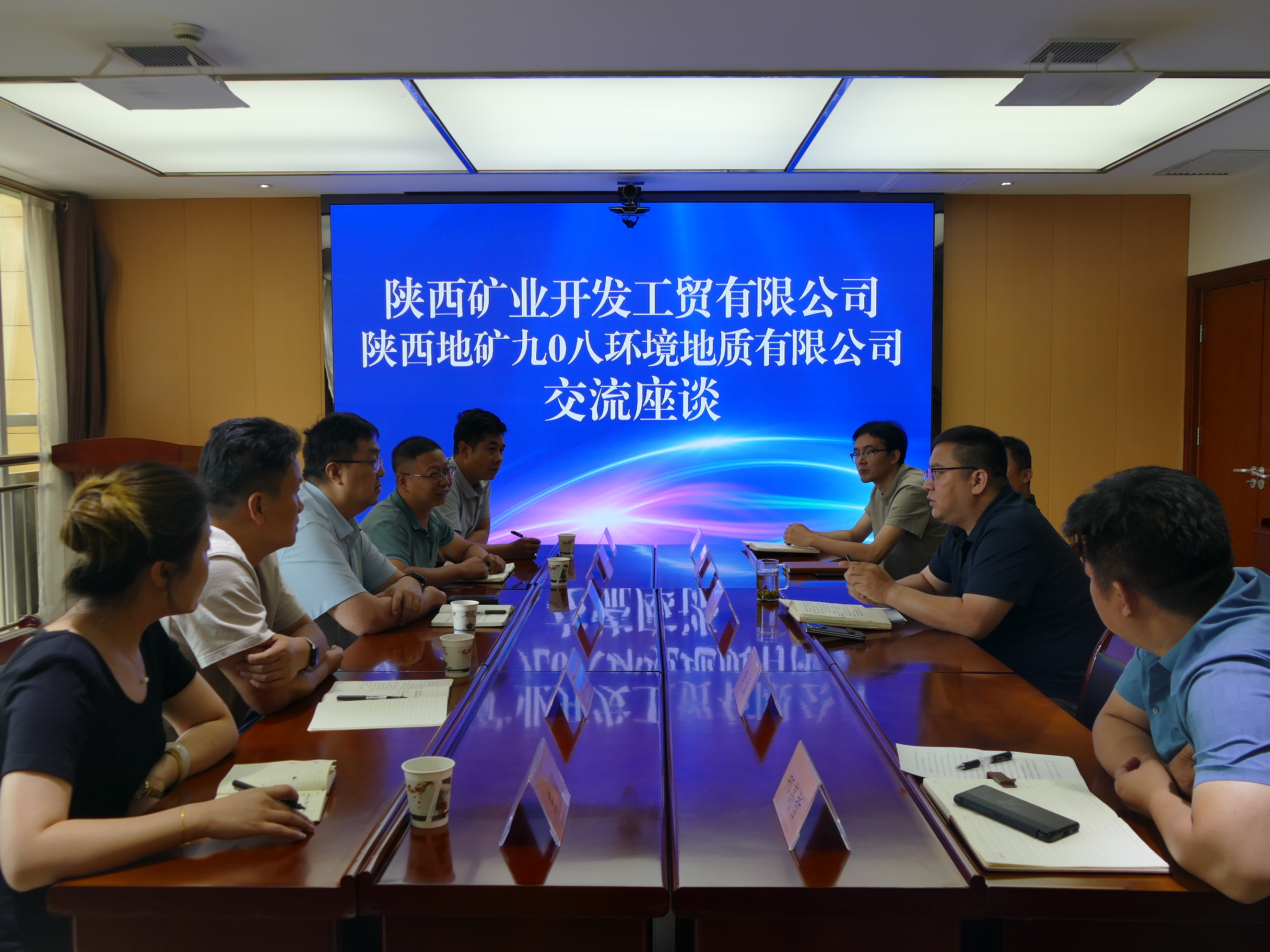 6月6日,陕西矿业开发工贸有限公司党支部书记、执行董事、总经理马晓炜一行到陕西地矿九0八公司交流座谈。九0八公司党委书记、执行董事、总经理王康主持会议。