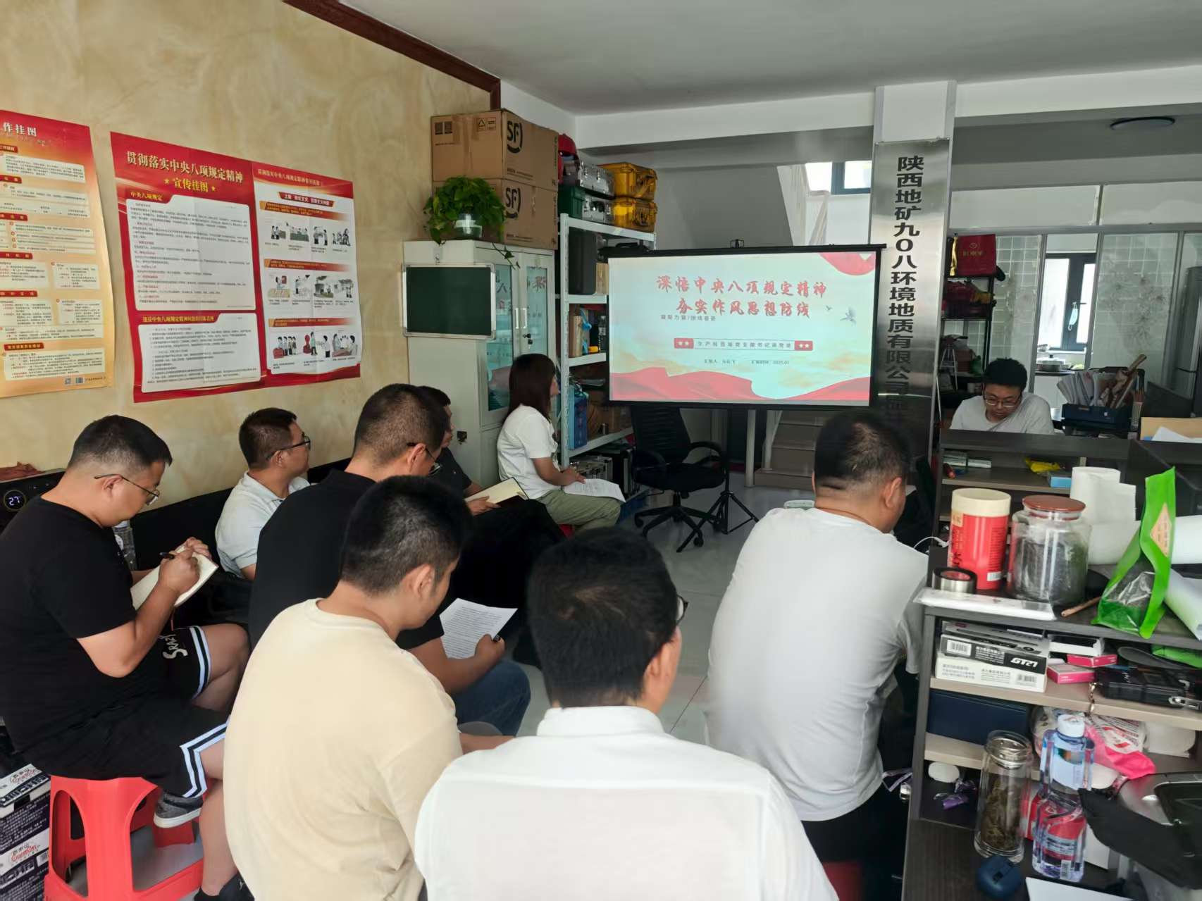 近日,生产经营第一党支部在榆林野外项目部召开党员大会,结合生产一线实际推进中央八项规定精神学习教育,支部书记元佳飞讲授专题党课,纪律委员白皓通报典型案例,支部全体党员参会。
