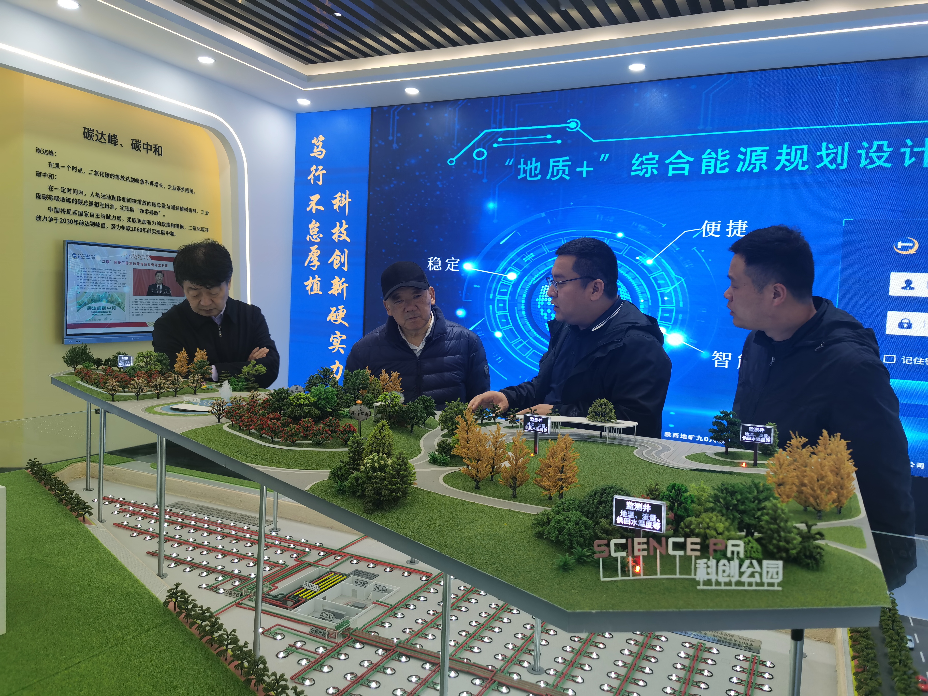 响应国家“碳中和、碳达峰”战略,在秦创原(泾阳)创新生态基地建设的浅层地热能示范项目,可提供5万平方米供暖制冷能力,实现夏季冷源和冬季热源的零碳化,实现地质行业向清洁能源产业转换。该项目作为科研教学基地,目前累计接待全国800人次。还探索了充分利用光电(热)、“谷电”及热泵机组,实现低价电及富余电的跨时段、跨季节利用,推进实施“源网荷储”一体化项目。