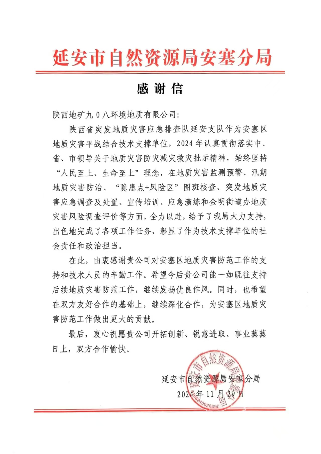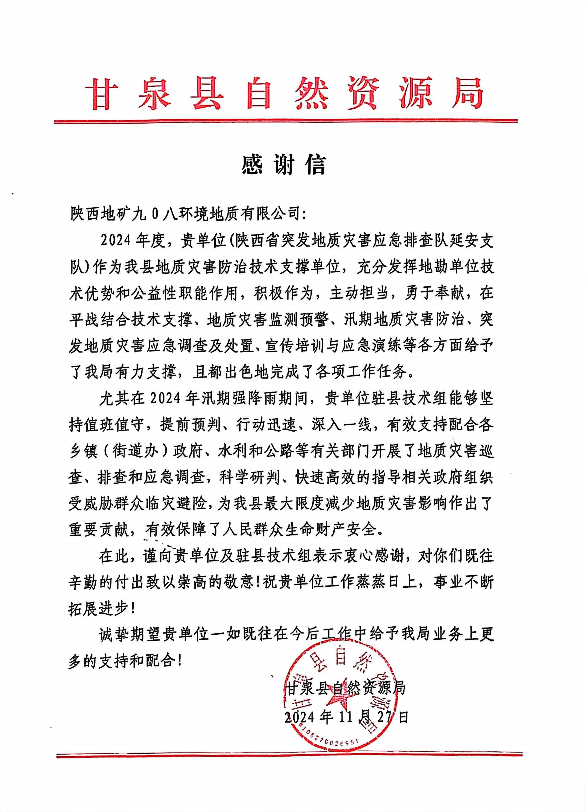 11月至12月初,九0八公司连续收到甘泉县自然资源局、子长市地质环境监测站、延安市自然资源局安塞分局、延安市自然资源局等单位的感谢信。信中提到,公司在工作中展现出了高度的专业素养和敬业精神,为当地防灾减灾、国土空间规划和用途管制提供了基础依据,为当地经济社会发展作出了积极贡献。