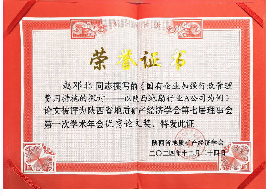 3月20日,陕西地矿九0八公司赵邓北撰写《国有企业加强行政管理费用措施的探讨——以陕西地勘行业A公司为例》论文在陕西省地质矿产经济学会第七届理事会第一次学术年会上荣获优秀奖。